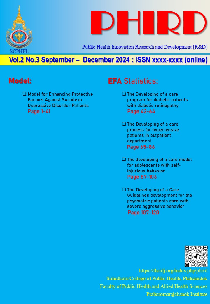 วิธีวิจัย: การศึกษาในครั้งนี้ เป็นการวิจัยและพัฒนาในขั้นที่ 1-2 โดยใช้แบบสอบถามเรื่อง ปัจจัยปกป้องต่อการฆ่าตัวตายในผู้ป่วยโรคซึมเศร้า การทบทวนวรรณกรรมและแบบบันทึกข้อมูล และใช้การวิเคราะห์ข้อมูลโดยใช้สถิติ เชิงบรรยาย เช่น ร้อยละ ค่าเฉลี่ย ส่วนเบี่ยงเบนมาตรฐาน ในการศึกษาของวัตถุประสงค์ข้อที่ 1 ใช้การทบทวนวรรณกรรม ข้อมูลจากผู้ทรงคุณวุฒิ โดยใช้แบบบันทึกข้อมูลและแบบประเมินองค์ประกอบของรูปแบบ และใช้การวิเคราะห์ข้อมูลโดยใช้สถิติ เชิงบรรยาย เช่น ร้อยละ ค่าเฉลี่ย ส่วนเบี่ยงเบนมาตรฐานในการศึกษาของวัตถุประสงค์ข้อที่ 2