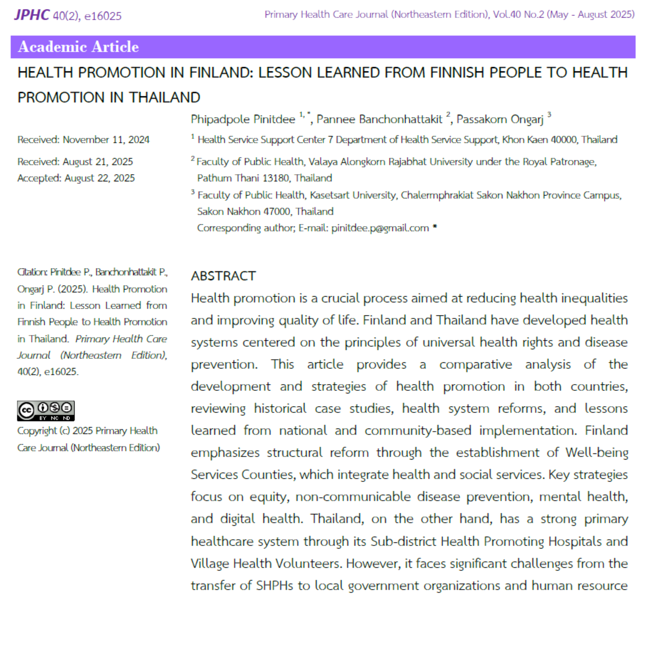 การส่งเสริมสุขภาพเป็นกระบวนการสำคัญที่มุ่งลดความเหลื่อมล้ำและยกระดับคุณภาพชีวิต ประเทศฟินแลนด์และประเทศไทยต่างพัฒนาระบบสุขภาพโดยยึดหลักสิทธิถ้วนหน้าและการป้องกันโรคเป็นศูนย์กลาง บทความนี้วิเคราะห์เชิงเปรียบเทียบพัฒนาการและกลยุทธ์ด้านการส่งเสริมสุขภาพของฟินแลนด์และไทย โดยทบทวนกรณีศึกษาเชิงประวัติศาสตร์และการปฏิรูประบบสุขภาพ ตลอดจนบทเรียนที่ได้จากการดำเนินงานระดับชาติและชุมชน โดยประเทศฟินแลนด์เน้นการปฏิรูปเชิงโครงสร้าง ผ่านการจัดตั้งเขตบริการสุขภาพและสวัสดิการที่บูรณาการบริการสุขภาพและสังคม กลยุทธ์หลักมุ่งสู่ความเสมอภาค การป้องกันโรคไม่ติดต่อเรื้อรัง สุขภาพจิต และสุขภาพดิจิทัล ขณะที่ประเทศไทยมีความเข้มแข็งในระบบสุขภาพปฐมภูมิ ผ่านโรงพยาบาลส่งเสริมสุขภาพตำบล (รพ.สต.) และอาสาสมัครสาธารณสุขประจำหมู่บ้าน (อสม.) แต่กำลังเผชิญข้อท้าทายสำคัญจากการถ่ายโอนโรงพยาบาลส่งเสริมสุขภาพตำบล (รพ.สต.) ไปสู่องค์กรปกครองส่วนท้องถิ่นและข้อจำกัดด้านทรัพยากรบุคลากร ถึงแม้ว่าทั้งสองประเทศใช้แนวทางต่างกัน แต่ยึดเป้าหมายร่วมคือการสร้างสุขภาพที่เท่าเทียมและยั่งยืน คำถามสำคัญคือ ฟินแลนด์จะรักษาความมั่นคงของระบบท่ามกลางสังคมสูงวัยได้อย่างไร และไทยจะผสานพลังชุมชนกับโครงสร้างเชิงนโยบายเพื่อสร้างระบบสุขภาพที่เข้มแข็งและยั่งยืนได้เพียงใด