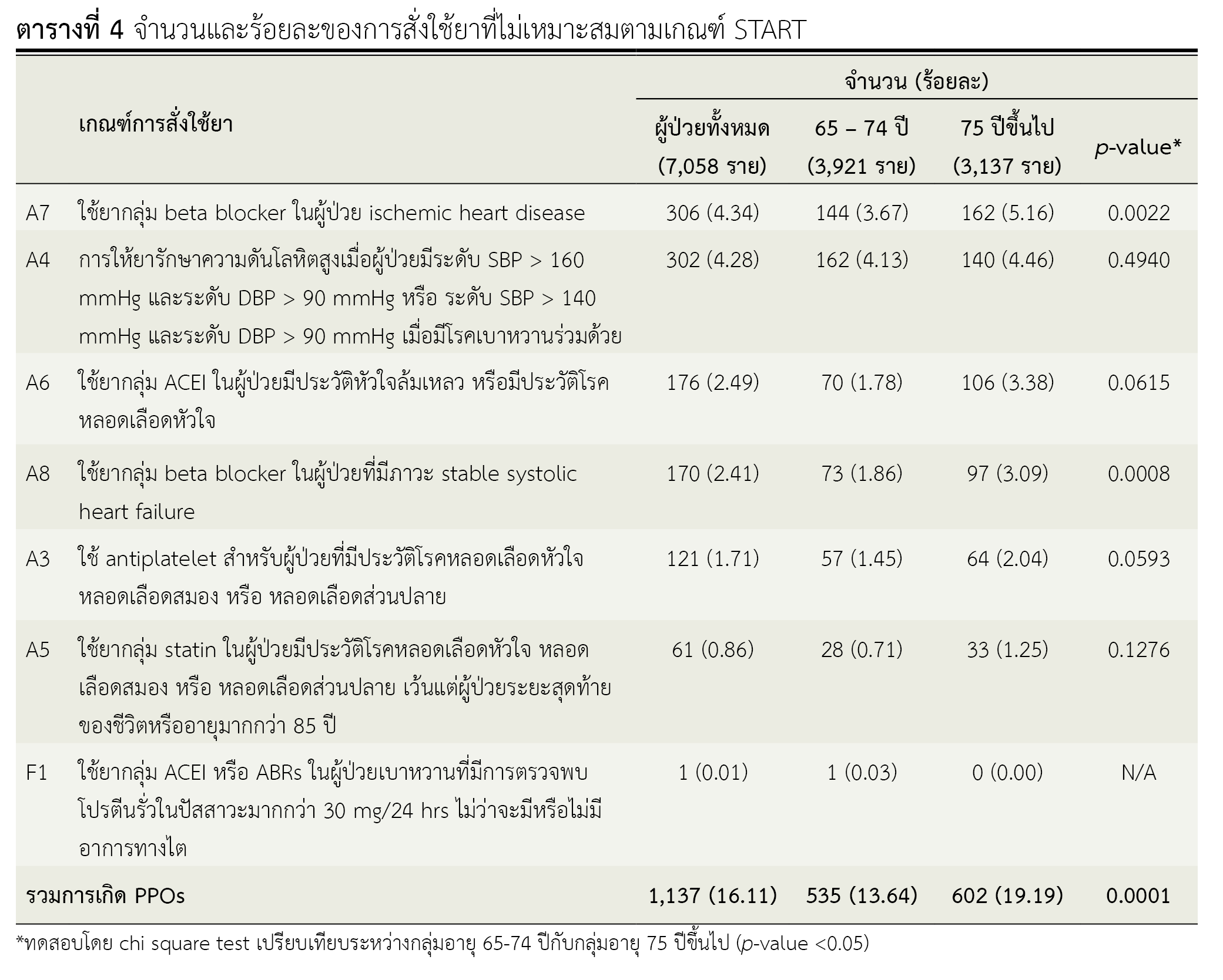 ผลการศึกษา: ผู้ป่วย 7,058 ราย พบการเกิด PIMs และ PPOs ตาม modified STOPP/STRART ร้อยละ 4.91 และ 16.11 ปัญหาที่พบมากคือ สั่งใช้ NSAIDs ในผู้ป่วยที่มีค่า eGFR < 50 ml/min/1.73 m2 ละเลยการใช้ยากลุ่ม beta blocker ในผู้ป่วย ischemic heart disease การเกิด PIMs ในผู้ป่วยผู้สูงอายุ 65-74 ปี จำนวน 184 ราย (4.69%) กับผู้ป่วยอายุตั้งแต่ 75 ปีขึ้นไปจำนวน 163 ราย (5.2%) ไม่มีความแตกต่าง (p=0.7899) การเกิด PPOs ในผู้ป่วยอายุตั้งแต่ 75 ปีขึ้นไป (จำนวน 602 ราย (19.19%)) สูงกว่าผู้ป่วยอายุ 65-74 ปี (จำนวน 535 ราย (13.64%))อย่างมีนัยสำคัญทางสถิติ (p=0.001)