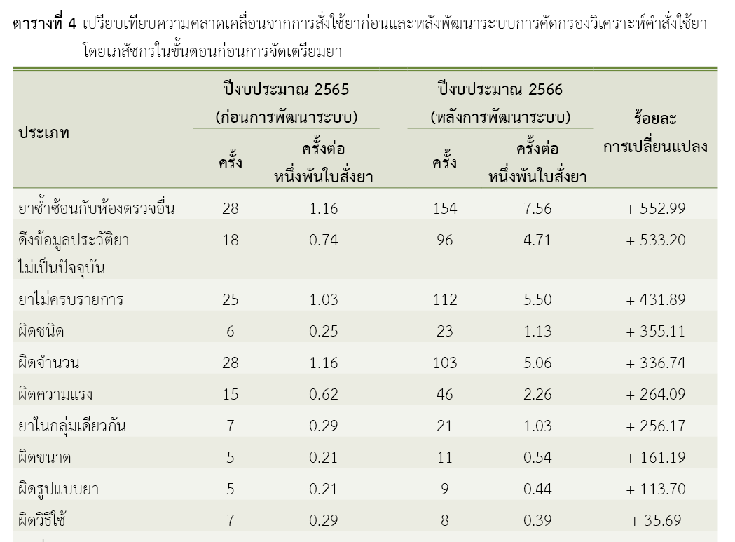 ผลการวิจัย: ในปีงบประมาณ 2566 เภสัชกรคัดกรองวิเคราะห์คำสั่งใช้ยาผู้ป่วยนอกอายุรกรรมในขั้นตอนก่อนการจัดเตรียมยารวม 20,374 ใบ พบความคลาดเคลื่อนจากคำสั่งการใช้ยา จำนวน 32.10 ครั้งต่อหนึ่งพันใบสั่งยา (654 ครั้ง) ซึ่งเพิ่มจากปีงบประมาณ 2565 ที่พบความคลาดเคลื่อนจากคำสั่งการใช้ยา จำนวน 9.92 ครั้งต่อหนึ่งพันใบสั่งยา (240 ครั้ง) โดยความคลาดเคลื่อนที่พบเพิ่มขึ้น 5 อันดับแรก ได้แก่ การสั่งยาซ้ำซ้อนกับห้องตรวจอื่น การดึงข้อมูลประวัติยาไม่เป็นปัจจุบัน การสั่งยาไม่ครบรายการ การสั่งยาผิดชนิด และการสั่งยาผิดจำนวน