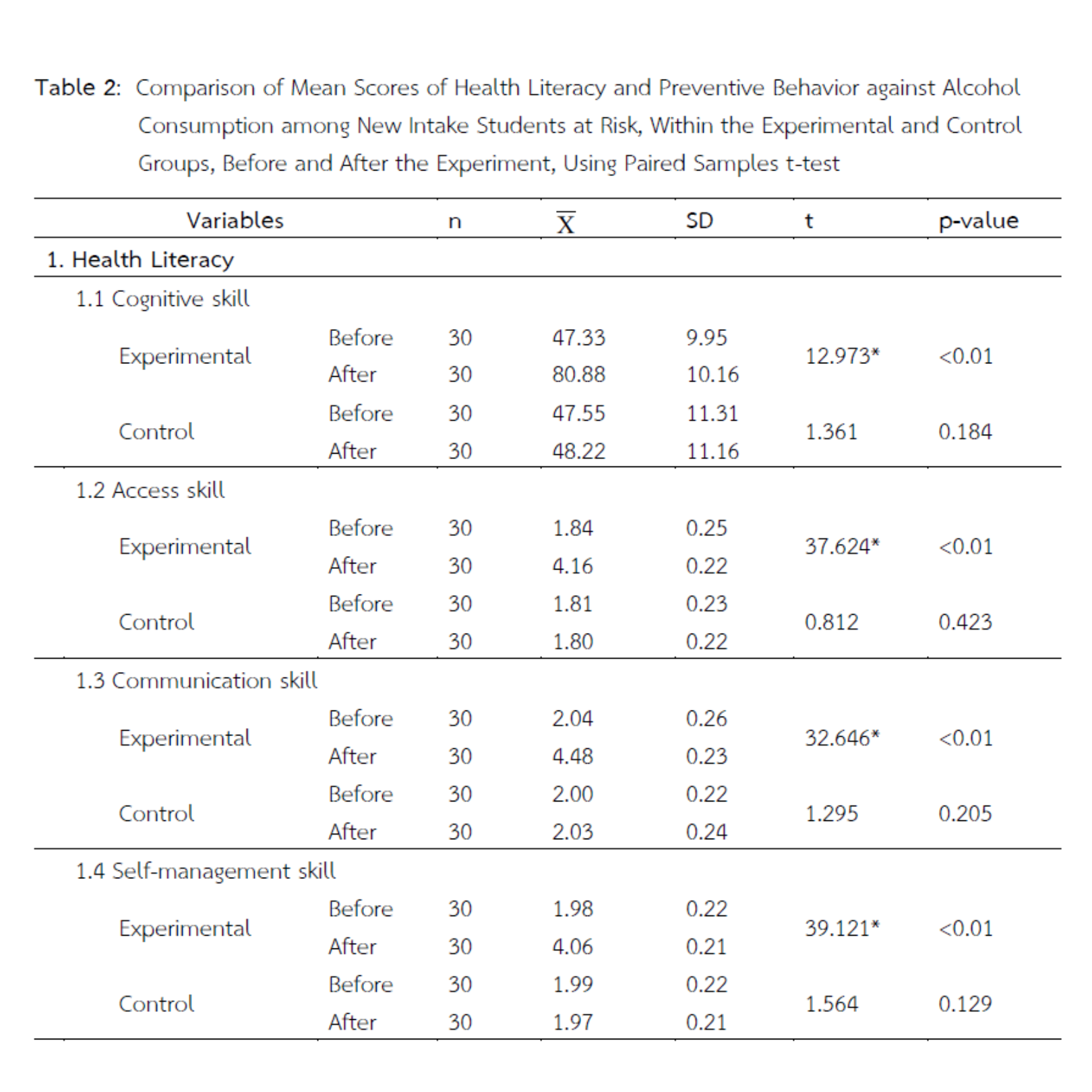 ประสิทธิผลโปรแกรมความรอบรู้ด้านสุขภาพสำหรับนักเรียนกลุ่มเสี่ยงหน้าใหม่ต่อพฤติกรรมป้องกันการดื่มเครื่องดื่มแอลกอฮอล์ โรงเรียนขยายโอกาสทางการศึกษา อำเภอปักธงชัย จังหวัดนครราชสีมา